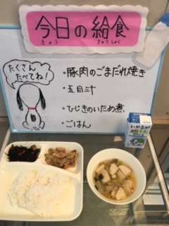今日の給食は、ごはん 牛乳 豚肉のごまだれ焼き 五目汁 ひじきのいため煮です。