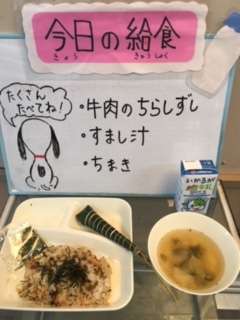 今日の給食は、ごはん 牛乳 牛肉のちらしずし すまし汁 ちまきです。