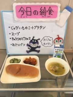 今日の給食は、おさつパン 牛乳 じゃがいものミートグラタン スープ きゅうりのピクルスです。