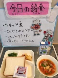 今日の給食は、パン 牛乳 ケチャップ煮 さんどまめのソテー りんごのクラフティ いちごジャムです。