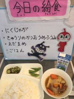 今日の給食は、ごはん 牛乳 肉じゃが きゅうりのかつお梅風味 えだまめです。