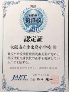 このたび、日本教育工学協会(JAET)から、「教育の情報化に総合的に取り組み、情報化によって教育の質の向上を実現している学校情報化優良校」として認定していただきました。