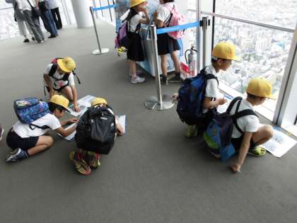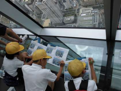 それぞれの方角から見える建物や施設をワークシートに書き込んでいます。