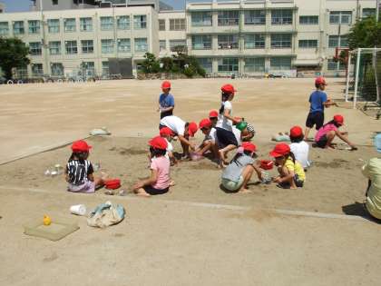 子どもたちは、水で砂を固めたり、土と水を混ぜて、ジュースに見立てて作ったり、とても楽しそうに活動していました。