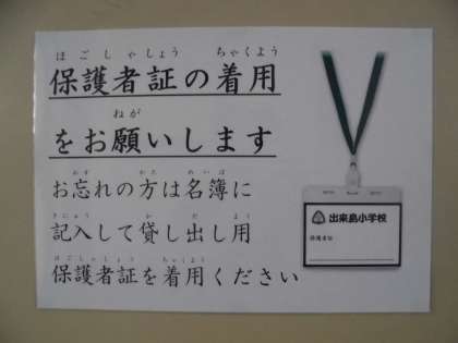 明日は土曜授業「避難訓練・防災・減災学習・引き渡し訓練」です。学校にお越しになられるときは、保護者証を持参していただき、校内では着用をお願いします。
