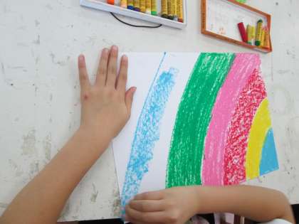 まず始めに、クレパスで5色以上を使い白画用紙を塗りつぶします。