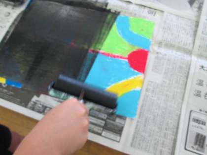 図工の授業でクレパスと版画インキを使う作品の準備をしました。