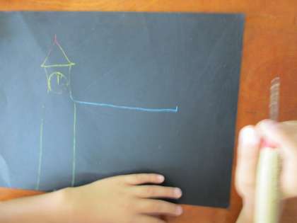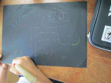 クレパスの上から版画インクを塗った絵に先のとがったもので彫りました。