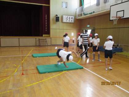 かえるの足うちや川跳び、かべ倒立などの段階を踏まえて行いました。