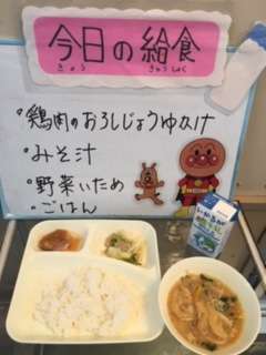 今日の給食は、牛乳 鶏肉のおろしじょうゆかけ みそ汁 野菜いためです。