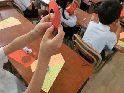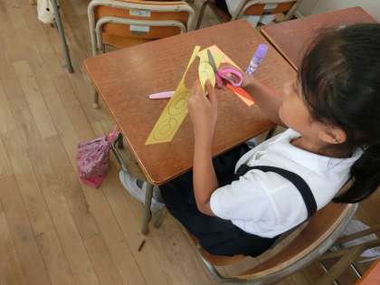 図画工作の時間にレインボーリングを作っています。輪っかをつなげて作ります。まずは、赤、だいだい、黄色の3色を切ってつなげました。「ばねみたいになっている!」と真剣に1つ1つ作っていました。