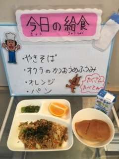 今日の給食は、パン 牛乳 焼きそば オクラのかつお梅風味 オレンジです。