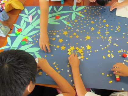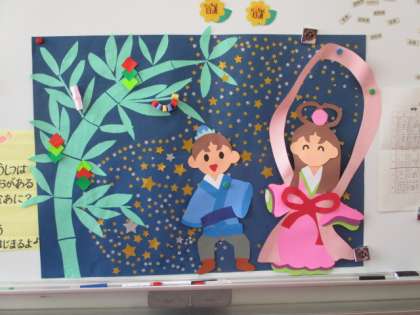 7月は七夕ということで、星をたくさん貼り付けて大きな天の川を作りました。