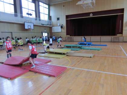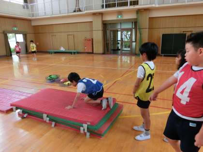 跳び箱の上で前転することは、初めてチャレンジする児童たちにとっては恐怖心でいっぱいでしたが、慣れてくるとどんどん元気にトライしていました。