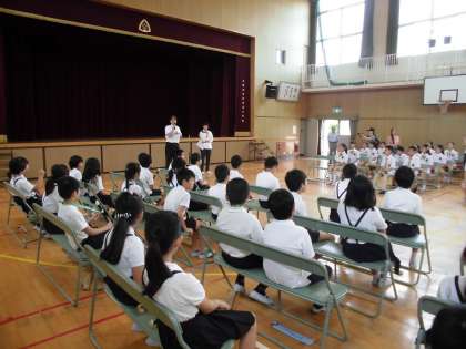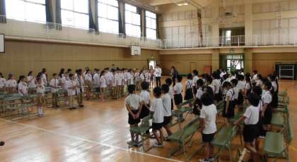 みなさんを拍手で出迎えた後、交流が始まりました。はじめに出来島小学校の校長先生が歓迎のあいさつをしました。