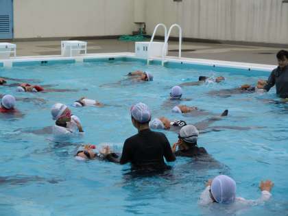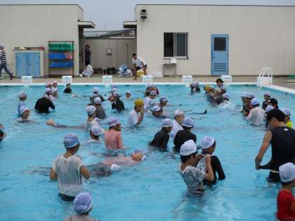 ペットボトルで浮かぶ、服に空気を入れて浮かぶなど、服を着ているときに流されてしまった時の対処のしかたを学びました。6年生は今年で2回目なので、去年より上手になっていました。