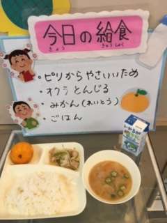 今日の給食は、ごはん 牛乳 ピリ辛野菜いため オクラとん汁 みかん(冷)です。