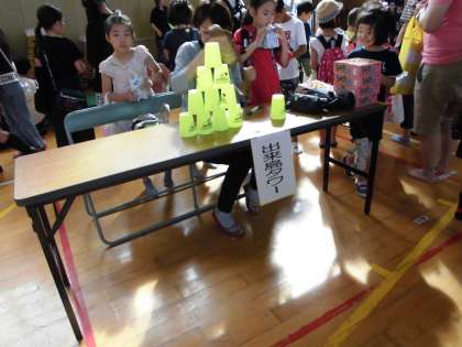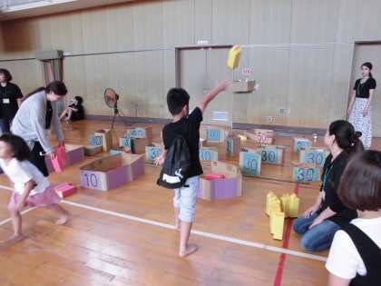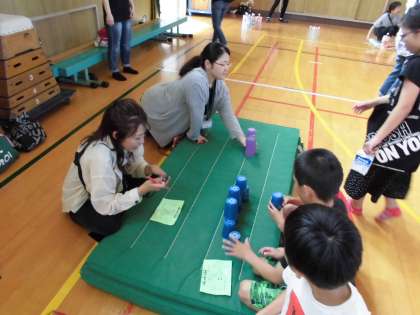 体育館の中では、「ピンポンパン」「ボーリング」「出来島タワー」「牛乳パックシュート」が行われました。みんな真剣に取り組んでいました。