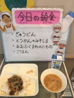 今日の給食は、ごはん 牛乳 牛丼 とうがんのみそ汁 大福豆の煮ものです。