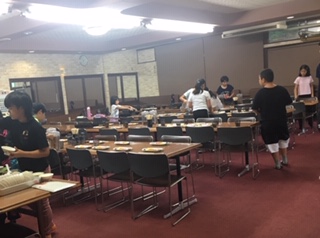 ご飯を入れたり、おみそ汁を運んだりして準備しています。