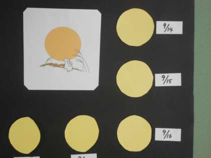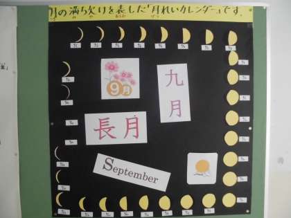 職員室前の掲示板を見ると、9月のお月さんの見え方が日にちごとに表されています。