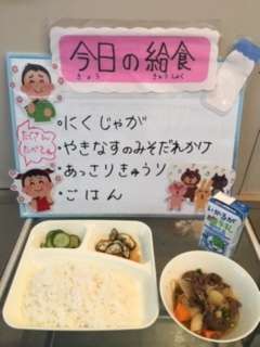 今日の給食は、ごはん 牛乳 肉じゃが 焼きなすのみそだれかけ あっさりきゅうりです。
