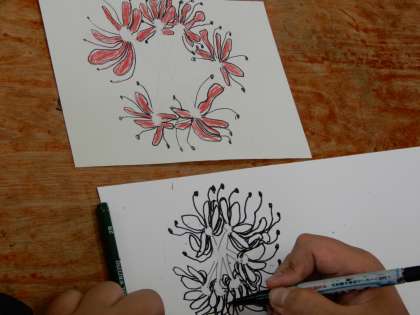 写真は、下描きで描いた花を見ながら描いている様子です。