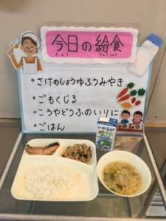 今日の給食は、牛乳、ごはん、さけのしょうゆ風味焼き、ごもくじる、高野豆腐のいり煮です。