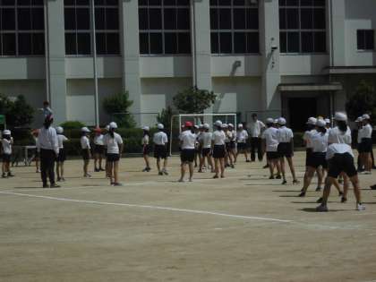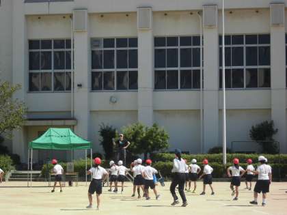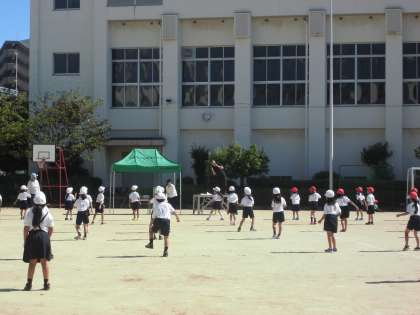 今日は朝から晴れ空が広がり、運動場では運動会練習真っ盛りです。