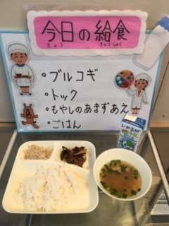 今日の給食は、牛乳、ご飯、プルコギ、トック、もやしの甘酢あえです。