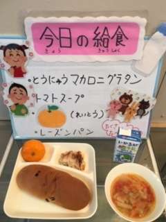 今日の給食は、牛乳、ぶどうパン、豆乳マカロニグラタン、トマトスープ、冷凍みかんです。