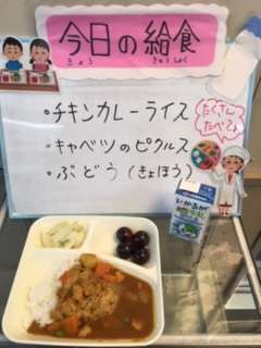 今日の給食は、牛乳 チキンカレーライス[米粉のルウ] キャベツのピクルス ぶどう(巨峰)です。