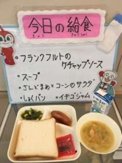 今日の給食は、牛乳 食パン イチゴジャム フランクフルトのケチャップソース スープ さんどまめとコーンのサラダ です。