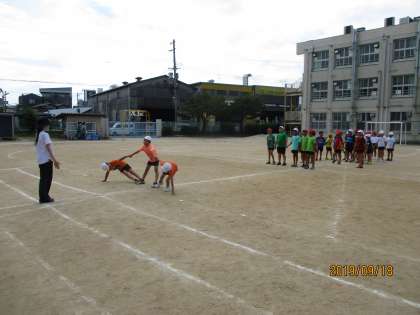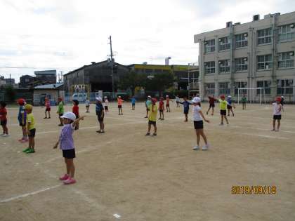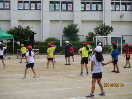 3年生は、カラーのTシャツを身に着けて、ダンスをします。今回は、入場からのダンス練習でした。列ごとに並んだり、円を描くように真ん中に集まったり、なかなか覚えるのも大変です。何とか子供たちも一生懸命覚えて、練習についてきています。