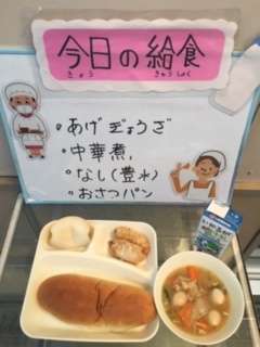 今日の給食は、おさつパン 牛乳 あげぎょうざ 中華煮 なし(豊水)です。