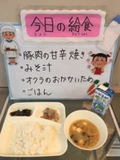 今日の給食は、ごはん 牛乳 豚肉の甘辛焼き みそ汁 オクラのおかかいためです。