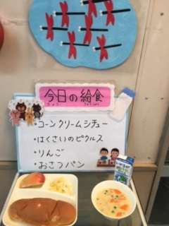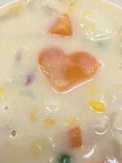 コーンクリームシチューはとろみがよく、コーンもたっぷり入っていました。ハート型のラッキーにんじんも子ども達に人気で、おいしかったです。