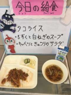 今日の給食は、ごはん 牛乳 タコライス もずくと白ねぎのスープ キャベツときゅうりのサラダです。