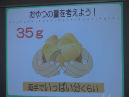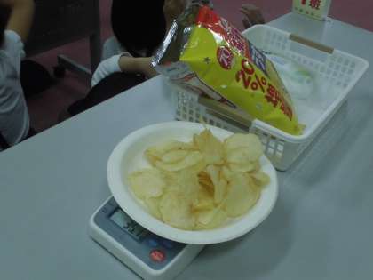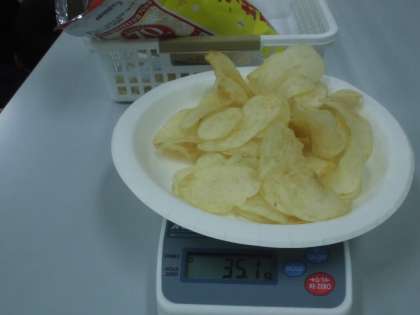 おやつを食べる量としては、ポテトチップスで35gが適当である。ということで、実際にどれだけのものかということを見て分かるように、それぞれのグループではかりを使って35g分のポテトチップスをはかりとってみました。