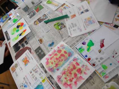 今日は子どもたちが帰ったあと、サクラクレパスさんをお招きして画材体験会を行いました。絵の具を使ったさまざまな技法を教えていただきました。
