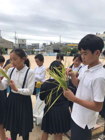 収穫した稲は、葉や実の入っていないものを取り除いていきました。