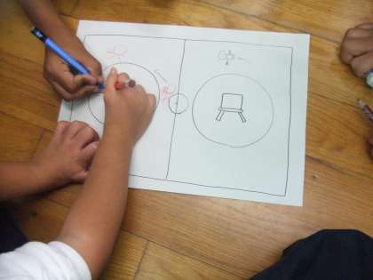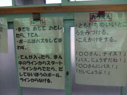 体育のボール運動で、まとあてゲームをしています。6人ずつの4チームに分かれ、作戦を立てて、ゲームに挑みます。第1回目のゲームをしましたが、どのチームも、どの子も一生懸命。