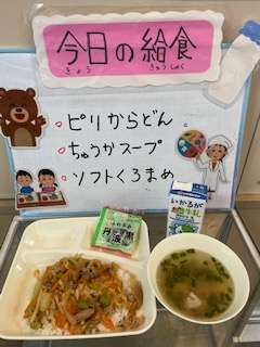 今日の給食は、ごはん 牛乳 ピリ辛丼 中華スープ ソフト黒豆です。