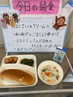 今日の給食は、パン 牛乳 はくさいのクリーム煮 あつあげのごまじょうゆかけ 豚肉とさんどまめのオイスターソースいためです。