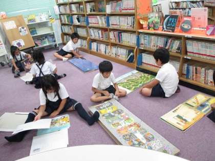 巨大絵本は、机にまで持っていけないので、床にそっと置いて読みます。大きな絵や文字も楽しめるね。先生からの『読み聞かせ』もあるね。次の先生からの読み聞かせの本も、楽しみにしておいてね。