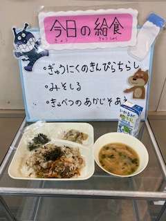今日の給食は、ごはん 牛乳 牛肉のきんぴらちらし みそ汁 キャベツの赤じそあえです。