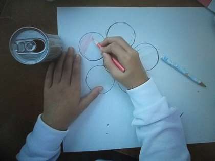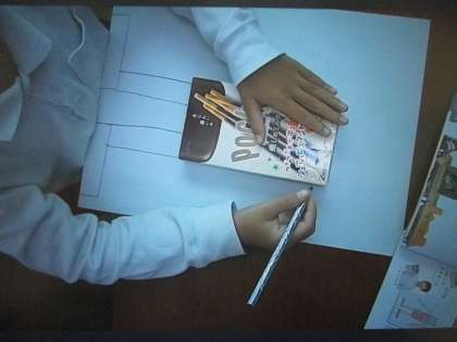 「かたちあそび」の学習で、いろいろな形の箱の型をとって、絵をかきました。