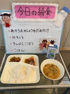 今日の給食は、ご飯 牛乳 あかうおのしょうゆだれかけ みそ汁 きんぴらごぼうです。