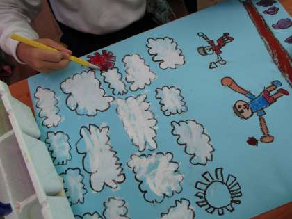 おいも堀りをした時の気持ちを思い出しながら、パスと絵の具を使って水色の画用紙に、大きく、伸び伸びと絵を描きました。