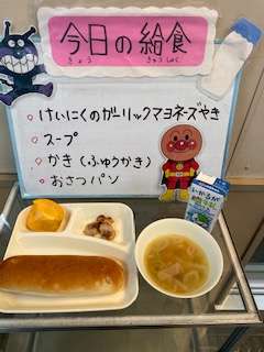 今日の給食は、おさつパン 牛乳 鶏肉のガーリックマヨネーズ焼き スープ 柿です。